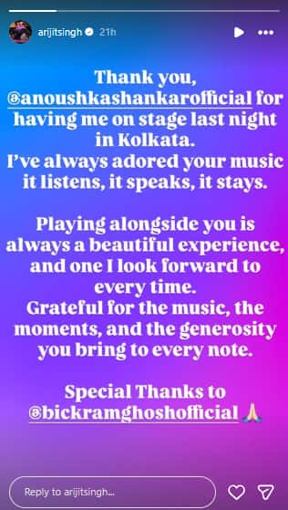 Soon after the concert, Arijit shared his first social media post since announcing he would not take on new playback work. Taking to his Instagram Story, the singer thanked Anoushka Shankar and spoke about how much he enjoyed performing with her.