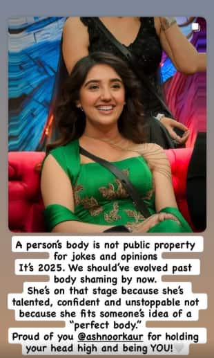 Taking to the Stories section of her Instagram handle, Jannat penned, “A person’s body is not public property for jokes and opinions. It’s 2025. We should’ve evolved past body shaming by now. She’s on that stage because she’s talented, confident and unstoppable not because she fits someone’s idea of a “perfect body”. Proud of you @ashnoorkaur for holding your head high and being You! (white heart emoji. (sic)”