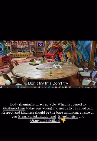 Slamming Kunickaa, Tanya, and Neelam, Rohan wrote, “Body shaming is unacceptable. What happened to @ashnoorkaur today was wrong and needs to be called out. Respect and kindness should be the bare minimum. Shame on you, @iam_kunickaasadanand, @neelamgiri_, and @tanyamittalofficial (sic),” along with a thumbs down emoticon.