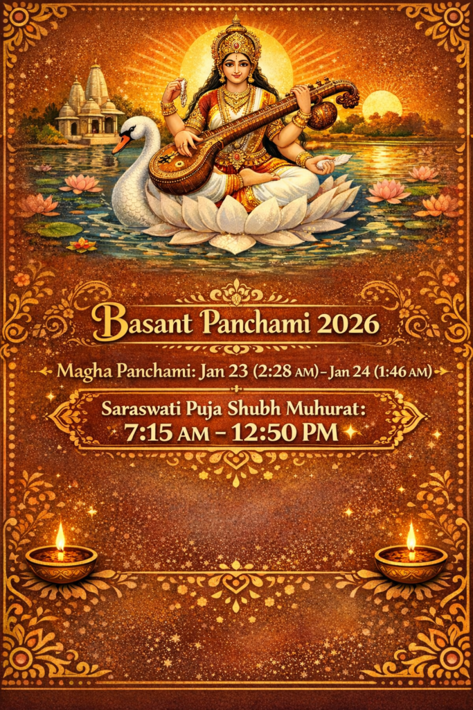 “As per the Panchang, the Panchami Tithi of Magha month will commence at 2:28 AM on January 23, 2026, and conclude at 1:46 AM on January 24. The most शुभ (auspicious) time for performing Saraswati Puja on Basant Panchami will be between 7:15 AM and 12:50 PM.