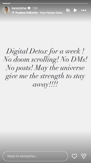 On Tuesday morning, Karan Johar took to his Instagram Stories to share a brief note about his decision. The post read, “Digital detox for a week. No doom scrolling! No DMs! No posts! May the universe give me the strength to stay away.”