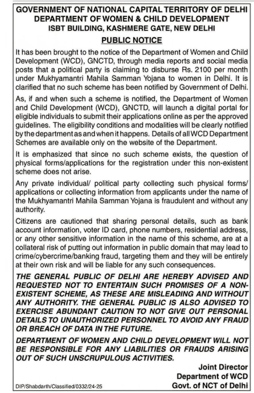 Another notice, by the Women and Child Development, read, “It has been brought to the notice of the Department of Women and Child Development (WCD), GNCTD, through media reports and social media posts that a political party is claiming to disburse Rs 2100 per month under Mukhyamantri Mahila Samman Yojana to women in Delhi.”