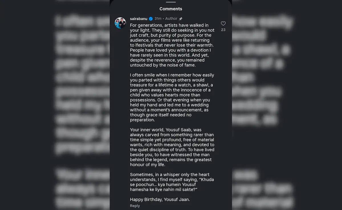She wrote, “My dearest Yousuf Saab, Every year, when this day returns, it brings with it a gentle stirring in my heart… a mourn of all the seasons I have watched you live, not merely as an artist for the world, but as the finest human being I have ever known. People often speak of you as an institution, a phenomenon, a genius beyond comparison and they are right”.
