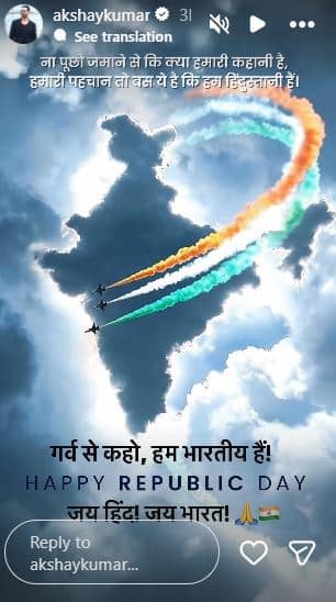 Akshay Kumar also extended his Republic Day greetings on Instagram, with the message “Let’s say with pride, we are Indians! Happy Republic Day. Jai Hind, Jai Bharat.”